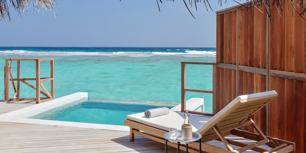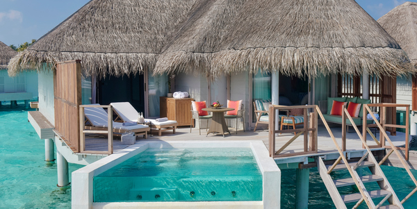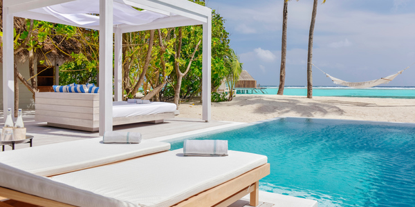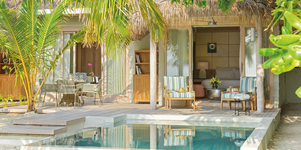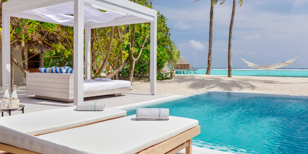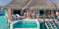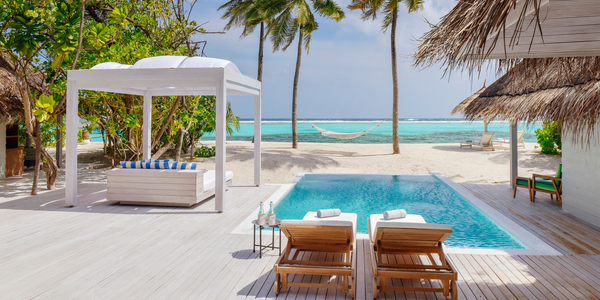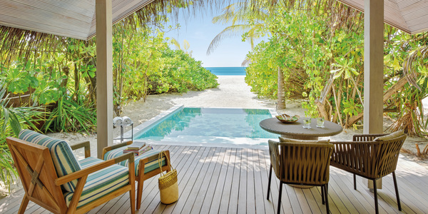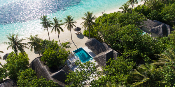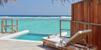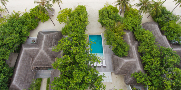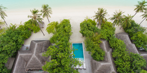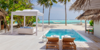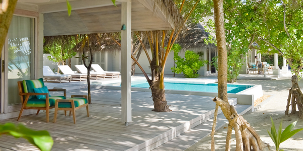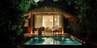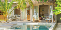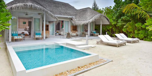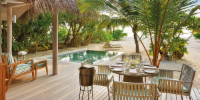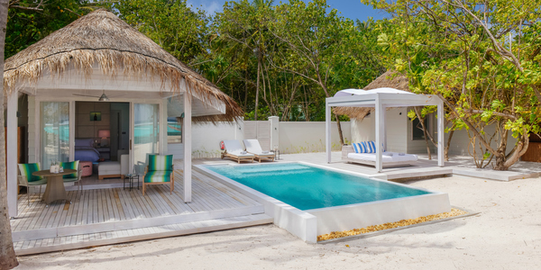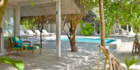 Виллы расположены на пляже, в окружении тропических садов, в нескольких шагах от лагуны. На вилле: 2 спальни (в каждой кровать «king-size» и угловой диван), 2 ванные комнаты на открытом воздухе (каждая с большой ванной и отдельным «тропическим» душем), 2 гардеробные, террасы с обеденным столом и зонами отдыха, собственный бассейн, газебо. Выход на пляж с шезлонгами. Вид на океан и на восход. Возможно размещение 2 доп. кроватей (платно). Дополнительные привилегии: 1 круиз на закате, 1 обед в ресторане Drift (расположен на частном острове) или 1 частный киносеанс под открытым небом, 4 бутылки воды Pure by Sun Resorts (ежедневно).